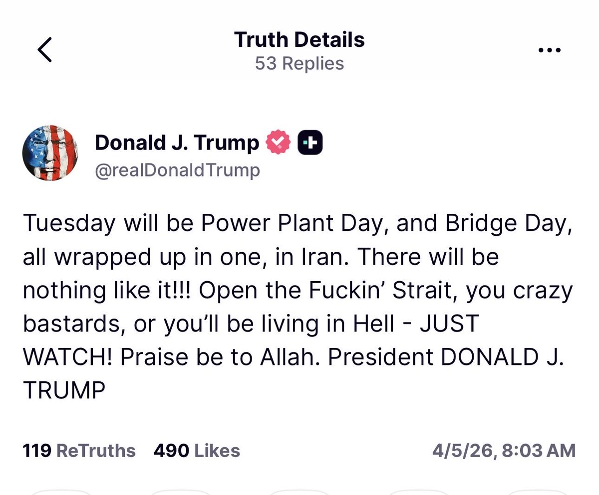"Tuesday will be Power Plant Day, and Bridge Day, all wrapped up in one, in Iran. There will be nothing like it!!! Open the Fuckin’ Strait, you crazy bastards, or you’ll be living in Hell - JUST WATCH! Praise be to Allah" https://t.co/XgLc6naQrP